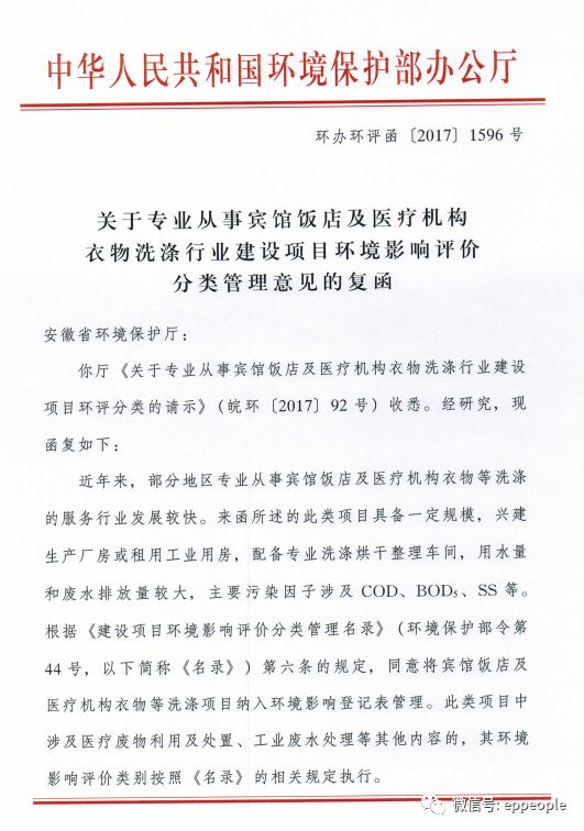 關(guān)于專業(yè)從事賓館飯店及醫(yī)療機(jī)構(gòu)衣物洗滌行業(yè)建設(shè)項(xiàng)目環(huán)境影響評(píng)價(jià)分類管理意見的復(fù)函